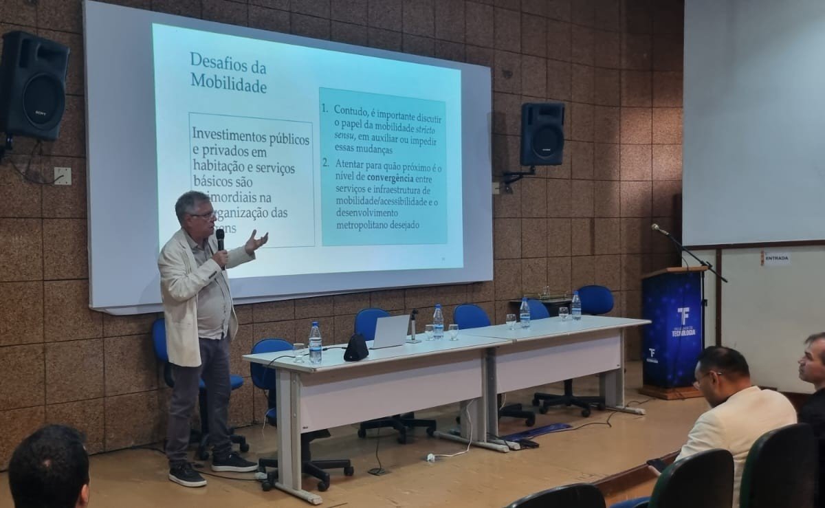 Após o encerramento da mesa de abertura, o Prof. Rômulo Dante Orrico Filho proferiu a Aula Magna, abordando os desafios da mobilidade urbana e seus impactos na qualidade de vida da população em grandes cidades. Em sua exposição, destacou a crescente necessidade de investimentos, pesquisa e planejamento voltados à infraestrutura urbana, ressaltando a importância do desenvolvimento científico, da formação de profissionais altamente qualificados e da atuação de programas de pós-graduação capazes de contribuir com soluções para problemas complexos das cidades.